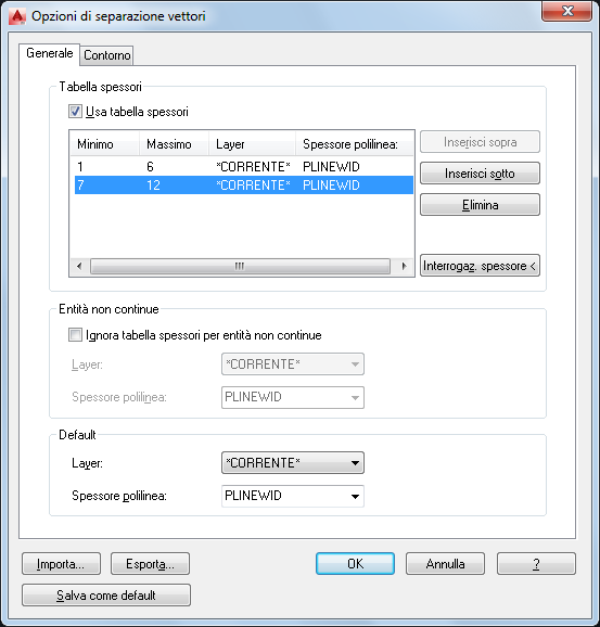 Le opzioni di separazione vettoriale possono essere utilizzate per assegnare automaticamente spessori di linea e layer alle linee vettoriali create con il processo di vettorizzazione. Le opzioni di separazione dei vettori sono disponibili nella scheda Impostazioni generali strumenti di vettorizzazione della finestra di dialogo Opzioni di AutoCAD Raster Design.