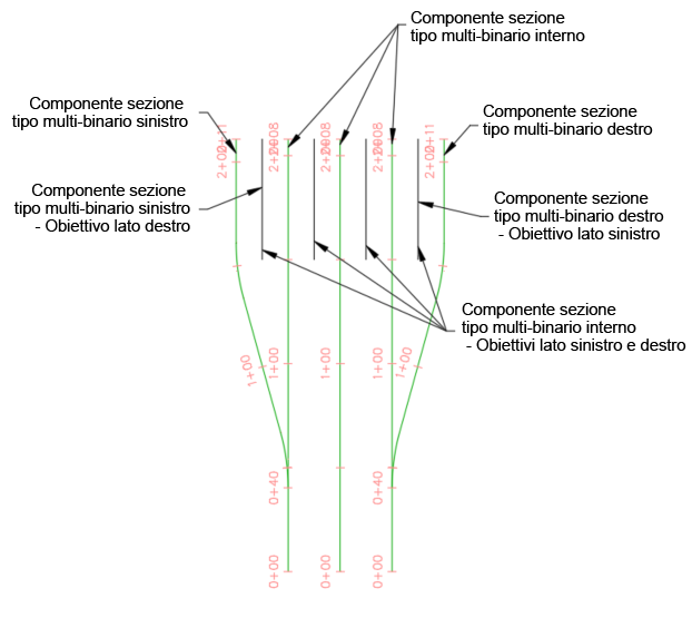 In modalità layout questo componente sezione tipo visualizza i collegamenti comprendenti le rotaie, le traversine, la massicciata, la sottomassicciata e le scarpate.
