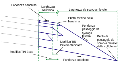 Modifica TIN Pavimentazione2 Ridotta larghezza del materiale della Pavimentazione2 per consentire l'interlacciamento di sottobase. Il bordo esterno dello strato di materiale avrà la stessa pendenza scarpata della banchina. Numerico, positivo