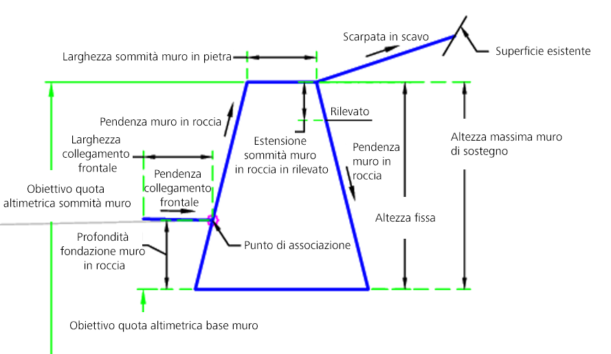 | Parte inferiore del muro | Può essere utilizzato per sostituire la quota altimetrica della parte inferiore del muro. Come obiettivi per la specifica della quota altimetrica è possibile utilizzare i seguenti tipi di oggetti: profili, polilinee 3D, linee caratteristiche o figure di rilievo. | Facoltativo |