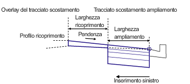 Il punto di associazione determina lo scostamento e la quota altimetrica del bordo esterno di allargamento. La posizione del bordo interno dell'allargamento e del bordo interno del ricoprimento dipendono dalla pendenza e dalle larghezze specificate. Per sostituire le larghezze numeriche specificate, è possibile utilizzare i tracciati. Se si specifica il profilo di ricoprimento, la pendenza viene calcolata tra la quota altimetrica del profilo in prossimità del bordo interno del ricoprimento e il punto di associazione.