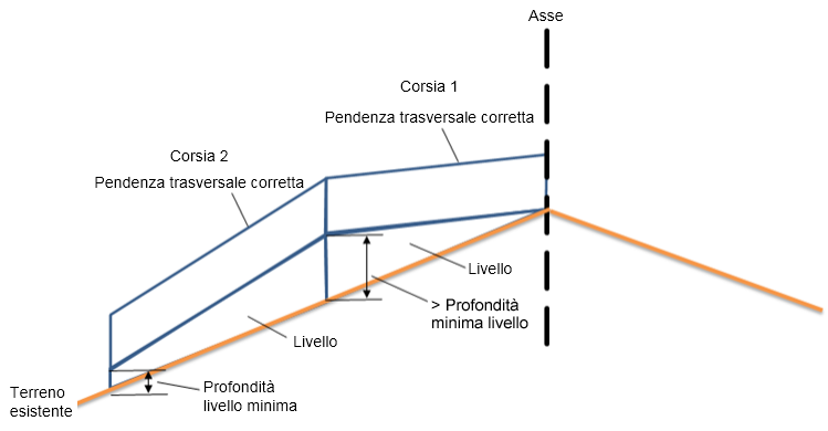 | Tolleranza pendenza | Pendenza terreno esistente meno pendenza trasversale ideale è -1%, che è maggiore della tolleranza pendenza di 0.5% |