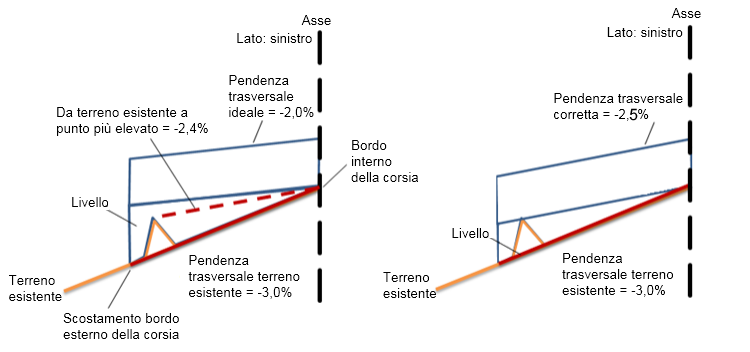 | Tolleranza pendenza | La pendenza trasversale terreno esistente meno la pendenza trasversale ideale è pari a 1.0%, che è maggiore della tolleranza pendenza di 0.5% |