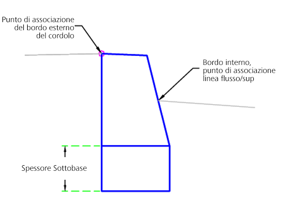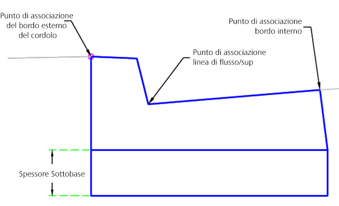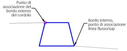 Punto di associazione Specifica la posizione del punto di associazione del cordolo. Bordo interno/Esterno del cordolo/Superficie linea flusso