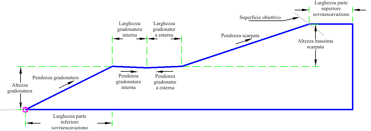 Si specifica un'altezza massima scarpata; se la distanza verticale tra il punto di inserimento e la superficie obiettivo è superiore all'altezza scarpata massima specificata, si verifica la gradonatura con i valori specificati di altezza, pendenza, inclinazione e larghezza della gradonatura; questa operazione si ripete fino al raggiungimento della superficie obiettivo.