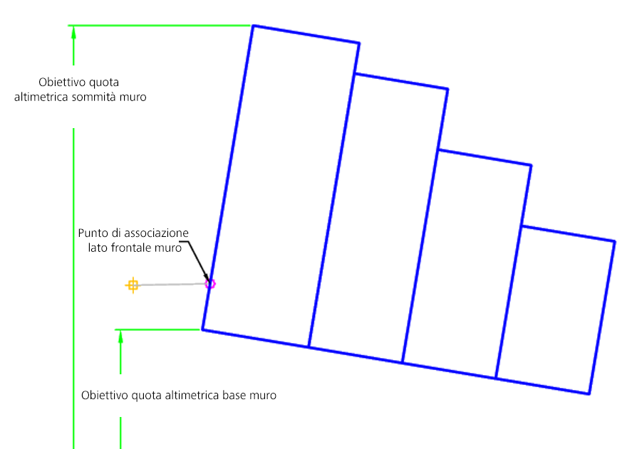 | Parte superiore del muro | Può essere utilizzato per impostare la quota altimetrica della sommità del muro. Come obiettivi per la specifica della quota altimetrica è possibile utilizzare i seguenti tipi di oggetti: profili, polilinee 3D, linee caratteristiche o figure di rilievo. | Facoltativo (punto di associazione = lato anteriore del muro) |