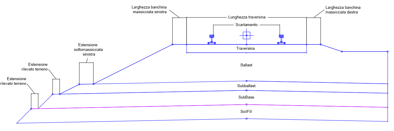 In modalità layout questo componente sezione tipo visualizza i collegamenti comprendenti le rotaie, le traversine, la massicciata, la sottomassicciata e le scarpate.