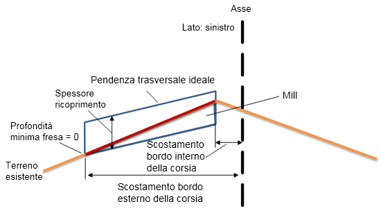 La pendenza trasversale e le regolazioni della quota altimetrica soddisfano Spessore livello minimo e/o Spessore fresatura minimo. La base è la superficie esistente.