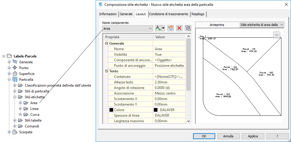 Le etichette dell'area della particella vengono visualizzate nella Carta come mostrato nell'anteprima della finestra di dialogo Composizione stile etichetta