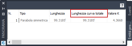Il valore Lunghezza curva totale mostra la lunghezza raccordo altimetrico totale, mentre la proprietà Lunghezza mostra la lunghezza della parte risolta della geometria della curva, ad esempio quando le tangenti sono collegate lungo le curve.