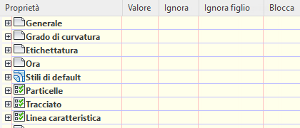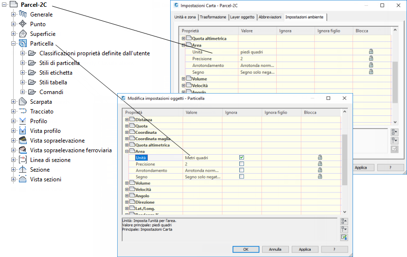 Il segno di spunta nella colonna Ignora della finestra di dialogo Modifica impostazioni oggetti - Particella (finestra di dialogo inferiore) indica che il valore impostato in questa finestra di dialogo sostituisce l'impostazione ad un livello superiore.