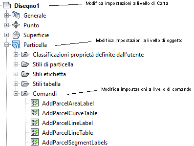 Al livello comando, questa finestra di dialogo contiene anche impostazioni specifiche dei comandi, come le impostazioni Particelle e Tracciati, che vengono utilizzate con il comando CreateSite.