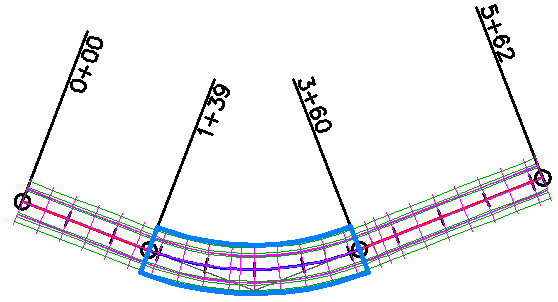 Nell'esempio che segue, la regione centrale è bloccata sulle progressive del tracciato. Quando la tangente precedente viene allungata, la regione centrale e tutte le altre regioni si spostano in modo che le progressive iniziali della regione vengano mantenute; in questo modo il modellatore risulterà obsoleto.