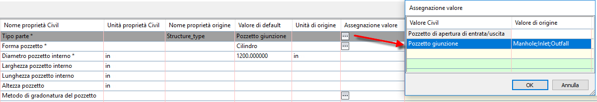 Nota: Se il Nome proprietà Civil presenta un asterisco (*) dopo il nome, è necessario specificare un Nome proprietà origine o un Valore di default.