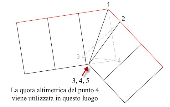 I punti 3 e 4 sono spostati in corrispondenza del punto 5 e la quota altimetrica del punto 4 viene utilizzata in tale posizione. La posizione e la quota altimetrica dei punti 1 e 2 rimangono invariate.