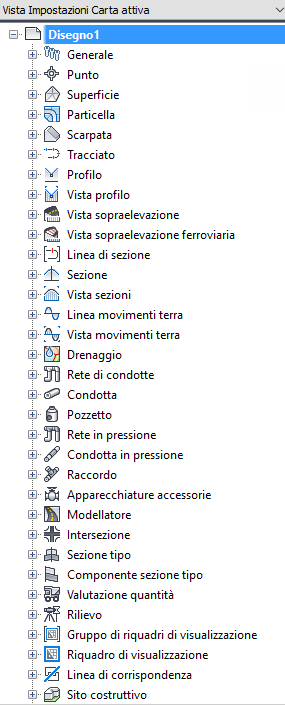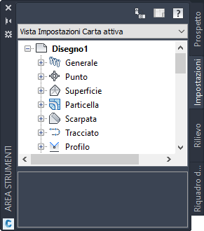 È possibile utilizzare la scheda Impostazioni per gestire gli stili degli oggetti di Autodesk Civil 3D e per controllare le impostazioni delle Carte e dei comandi.