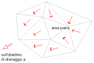 Se alcuni triangoli opposti non piani pendono in discesa dal contorno dell'area piana ma tutti defluiscono allo stesso punto di riferimento di drenaggio, l'area piana fa parte del bacino idrografico per tale punto di riferimento di drenaggio “a”, come illustrato nella figura seguente: