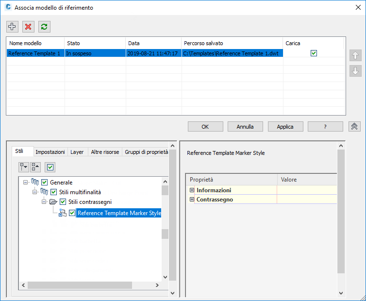 Nota: Se si deseleziona la casella di controllo Carica e si fa clic su Applica o su OK, i componenti non utilizzati da un modello di riferimento vengono rimossi dalla Carta e tale Carta non viene aggiornata con le ulteriori modifiche apportate al modello di riferimento. I componenti che sono stati utilizzati, ad esempio i layer, restano nella Carta.