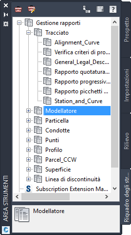 Nella scheda Riquadro degli strumenti sono organizzati i rapporti per ogni tipo di oggetto. I rapporti forniscono in un formato compatto e trasferibile i dati tecnici utili contenuti in una Carta. Alcuni sono in formato LandXML, con fogli di stile XSL predefiniti o personalizzati. Altri sono in formato VBA, con finestre di dialogo personalizzate che consentono di selezionare i dati e varie opzioni.
