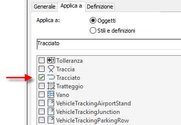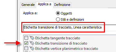 Per la maggior parte dei tipi di etichetta, nella scheda Applica a della finestra Gestione stili, selezionare il tipo di oggetto a cui si desidera applicare un'etichetta, invece del tipo di etichetta dell'oggetto correlato (per eccezioni, vedere il paragrafo seguente). Ad esempio, per etichettare i tracciati con dati di proprietà, selezionare Tracciato quando si configura il gruppo di proprietà.