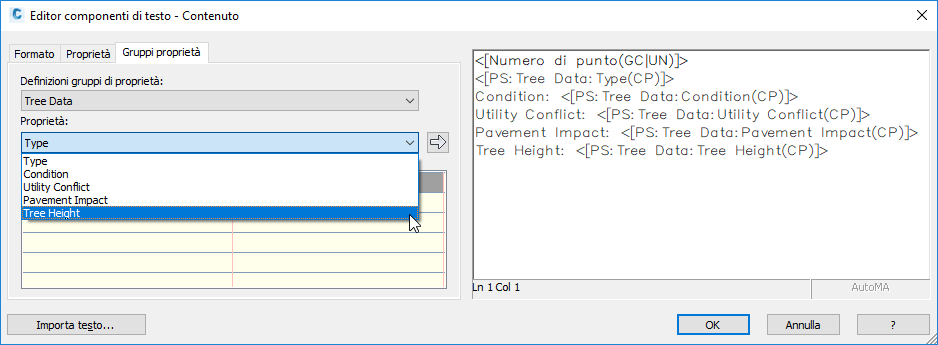 È possibile applicare il gruppo di proprietà ai punti, quindi aggiungere i dati del gruppo di proprietà rilevanti allo stile di etichetta di proiezione utilizzando l'Editor componenti di testo.