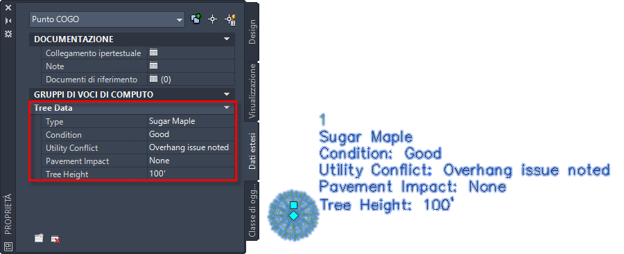 È possibile impostare stili di etichetta personalizzati che includano i dati dei gruppi di proprietà configurati per gli oggetti di Autodesk Civil 3D.