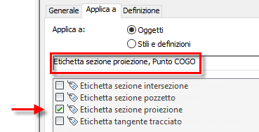 Se si desidera includere i dati del gruppo di proprietà negli stili di etichetta di intersezione, è necessario selezionare il tipo di oggetto Etichetta sezione proiezione oltre al tipo di oggetto la cui proiezione è visualizzata nella vista sezioni.