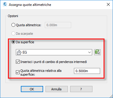 Durante la creazione di una linea caratteristica, è possibile immettere manualmente una quota altimetrica o assegnare quote altimetriche da una superficie o da oggetti scarpata.