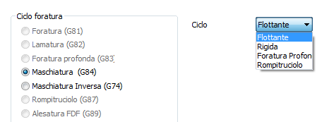Maschiatura (G84) — Selezionare il tipo di maschiatura usando l'opzione Tipo maschiatura. Le scelte sono Flottante, Rigida, Foratura profonda e Rompitruciolo. Tutti i cicli usano lo stesso formato del programma di maschiatura, ma le parole logiche riservate esistono in XBUILD per distinguere il tipo di maschiatura specificato.