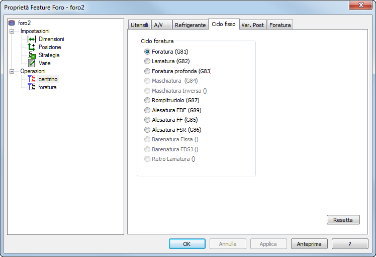 Alesatura — Questo ciclo ha effetto su come viene eseguita l'alesatura. Le scelte sono Alesatura FDF (avanzamento-sosta-avanzamento) (G89), Alesatura FF (avanzamento-avanzamento) (G85) e Alesatura FSR (avanzamento-stop mandrino-uscita) (G86).