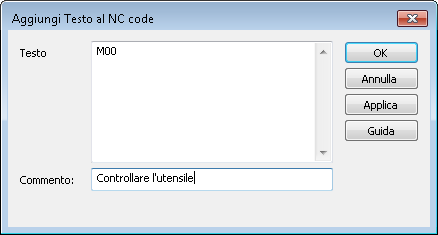 Per visualizzare la finestra di dialogo Aggiungi testo al codice NC, fare clic su Aggiungi testo al codice NC