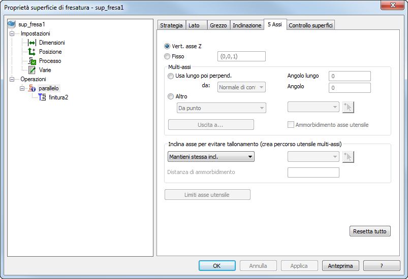 Questa scheda permette di impostare tre cose diverse: Asse utensile, Inclina asse per evitare tallonamento e Limiti asse utensile. Le prime due sezioni della finestra di dialogo possono confondere perché controllano entrambe l'inclinazione dell'asse utensile. Si pensi alla prima sezione, Asse utensile, come primo livello di inclinazione utensile, gestito in modo manuale. È poi possibile aggiungere un'inclinazione ulteriore per poter evitare tallonamenti con la pinza utensile usando Evita tallonamenti per inclinazione asse.