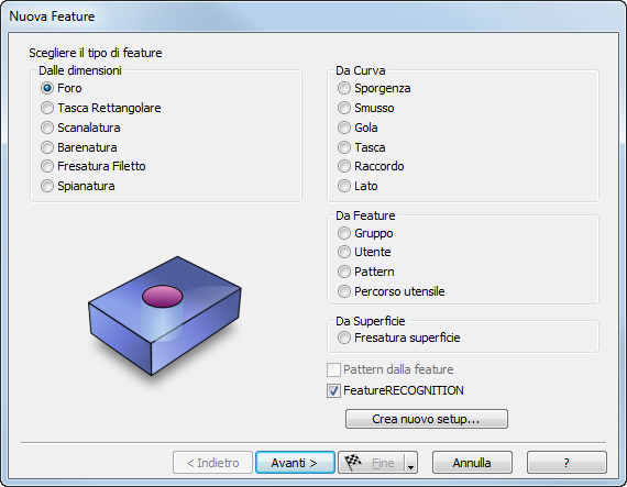 - Se si ha più di un'operazione, facendo clic su Avanti si apre la pagina Nuova Feature - Utensile di default per la successiva operazione. Se non si hanno ulteriori operazioni, facendo clic su Avanti si apre la pagina Nuova Feature - Sommario.