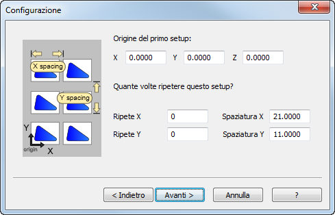 Se erano stati inseriti valori nei campi Ripete X o Ripete Y viene visualizzata la scheda Layout, dove è possibile specificare il layout dei setup ripetuti.
