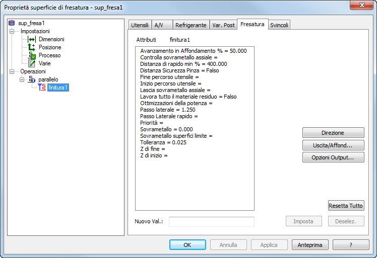 Sovrametallo — Questa è la quantità di materiale da lasciare dopo una passata di finitura 3D. Se non viene impostato alcun valore, il Sovrametallo è come impostazione predefinita uguale a 0. Si può inserire un numero negativo (fino al raggio utensile) per permettere la riduzione del volume o lo spazio della scintilla, e la parte è lavorata in superfici, del valore negativo specificato.