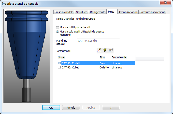 Selezionare Mostra solo quelli utilizzabili da questo mandrino per nascondere le pinze che non rientrano nel mandrino attuale. Selezionare Mostra tutti i portautensili per mostrarli tutti.