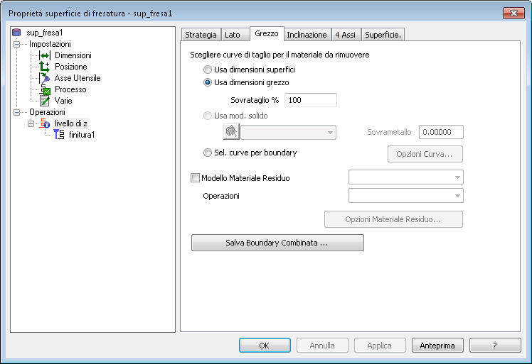 Salva boundary combinata — Fare clic su questo pulsante per visualizzare e salvare la boundary per l'operazione. La boundary è una combinazione della boundary del bordo, la boundary della curva del grezzo e il limite di inclinazione. Questo potrebbe richiedere un po' di tempo per essere calcolato, ma viene calcolato e salvato con l'operazione, ovvero, elaborato solo una volta.