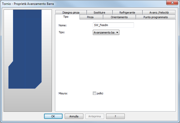 Il gruppo utensili Avanzamento barra rappresenta sia l'avanzamento barra che la barra di scorrimento. Questa gruppo utensili ha una scheda Tipo invece di una scheda Inserto.