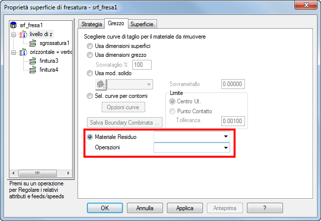 Per fare ciò, sulla scheda Grezzo per la seconda feature, selezionare Modello materiale residuo e selezionare il nome del modello materiale residuo e l'operazione che si vuole usare dall'elenco Operazioni: