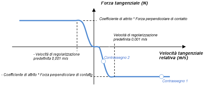 Nei contatti 2D viene utilizzata la legge di attrito di Coulomb su base non lineare reale. Nei giunti e nei contatti 3D, per semplicità e per evitare una condizione iperstatica, viene utilizzata la legge di Coulomb regolarizzata, che può essere illustrata come indicato di seguito: