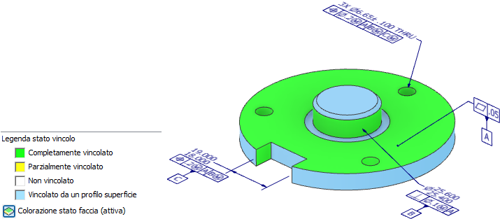 L'opzione Verifica tolleranza visualizza ora lo stato vincolo utilizzando un codice colore. Fare clic su Colorazione stato faccia nella Verifica tolleranza per attivare la visualizzazione dei colori.