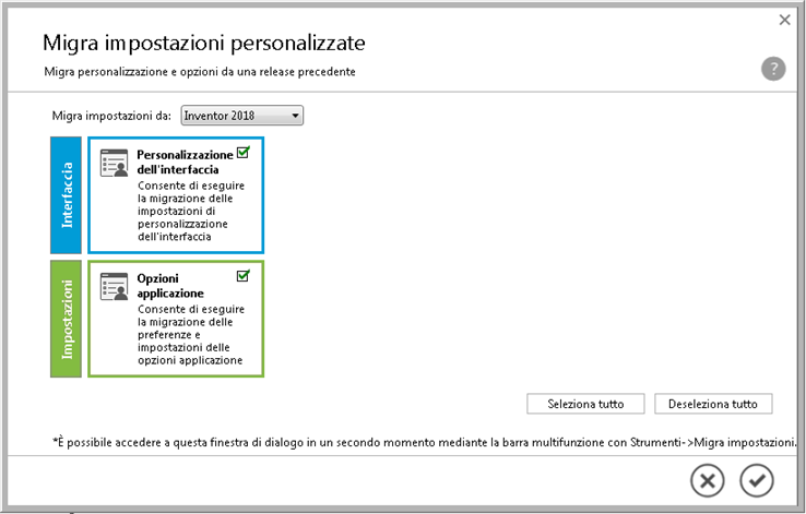 Utilizzare Esegui migrazione impostazioni personalizzate per importare le impostazioni di Opzioni applicazione e di personalizzazione esistenti nella release di Inventor più recente. Gli amministratori dispongono di controllo aggiuntivo sull'uso di questa opzione nelle installazioni client.