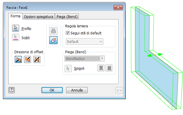 Molti hanno richiesto la possibilità di centrare la parte in lamiera lungo il suo spessore. La loro richiesta è stata ascoltata e il comando Faccia supporta ora l'estrusione dal piano medio per creare una faccia simmetrica.