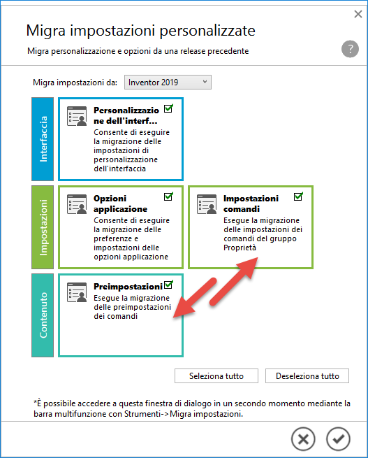 Quando si installa una nuova versione di Inventor, è possibile eseguire la migrazione di alcune impostazioni da una versione precedente. Selezionare il gruppo di impostazioni di cui eseguire la migrazione.