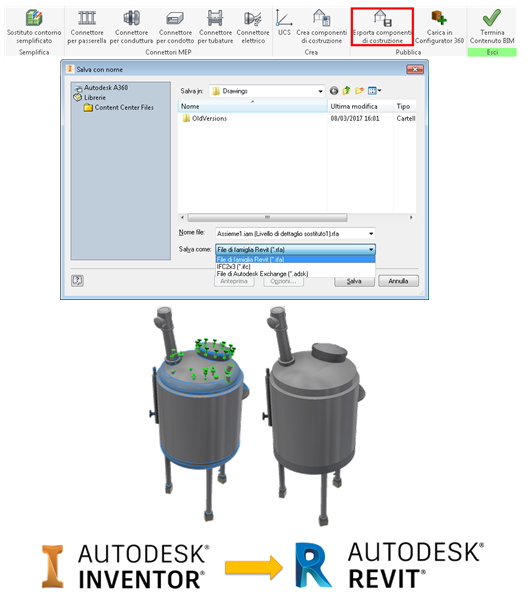 Contenuto BIM è stato migliorato per i flussi di lavoro di semplificazione, creazione e pubblicazione. Con Inventor 2018 è possibile pubblicare direttamente nei formati di file IFC e Revit (.rfa).