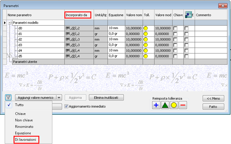 La finestra di dialogo Parametro è stata migliorata per includere una colonna Incorporato da e un filtro Per lavorazioni.