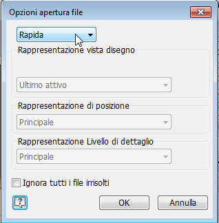 Una casella combinata per l'apertura in modalità Completa o Rapida è stata aggiunta tra i pulsanti Opzioni ... e Avvio rapido. È possibile aprire i documenti in entrambe le modalità senza avviare la finestra di dialogo Opzioni.