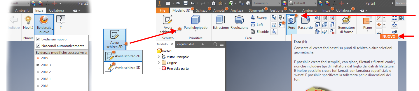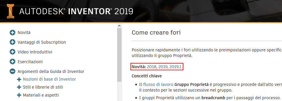 Inoltre, quando si utilizza F1 per accedere ad una pagina della Guida, ove applicabile, nella parte superiore della pagina vengono visualizzati i collegamenti all'argomento Novità che descrive le modifiche alla lavorazione o al comando.
