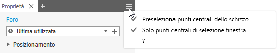 Pre-selezione punti centrali di schizzo: selezionando questa opzione, tutti i punti centrali di schizzo inutilizzati nello schizzo attivo verranno automaticamente selezionati per consentirne l'uso tramite il comando Foro, componendo ciascun punto centrale con un foro.