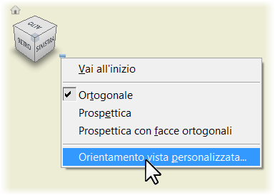 Fare clic con il pulsante destro del mouse sul ViewCube, quindi su Orientamento vista personalizzato per accedere all'ambiente Vista personalizzata. Specificare quindi l'orientamento della vista personalizzata.